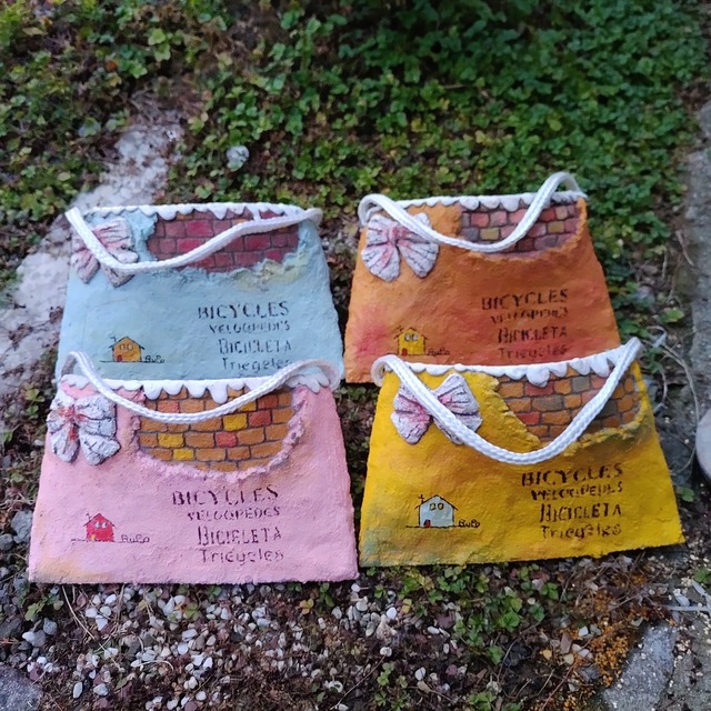 業務用のトマト缶を バックの形に整えてから、 モルタルを貼り付け 可愛く仕上げました。 横幅は、24センチです。